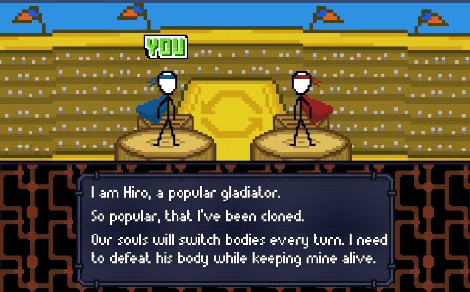 Slay Yourself, an entry in last month’s GMTK Game Jam 2023, faces you off against your own clone in gladiatorial combat. This game features turn-based RPG-style combat, but with a puzzling twist: with each turn, you reverse roles with your clone. Can you make choices that force your clone into a losing strategy? This mind-bending game will make you appreciate git revert as a much-needed partner to git clone.